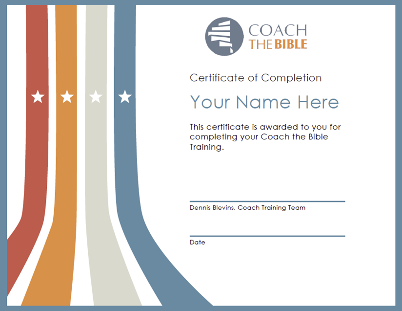 You have diligently completed the required training of Coach the Bible. We have confidence that you have the COMMITMENTS, CONVICTIONS, CHARACTER, and COMPETENCE as a mature disciple of Jesus. As evidence of your commitment to excellence and faithfulness to complete the course, you now have EXPERIENCE to help the Church fulfill the Great Commission…creating disciples of Jesus Christ.